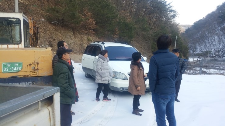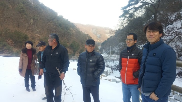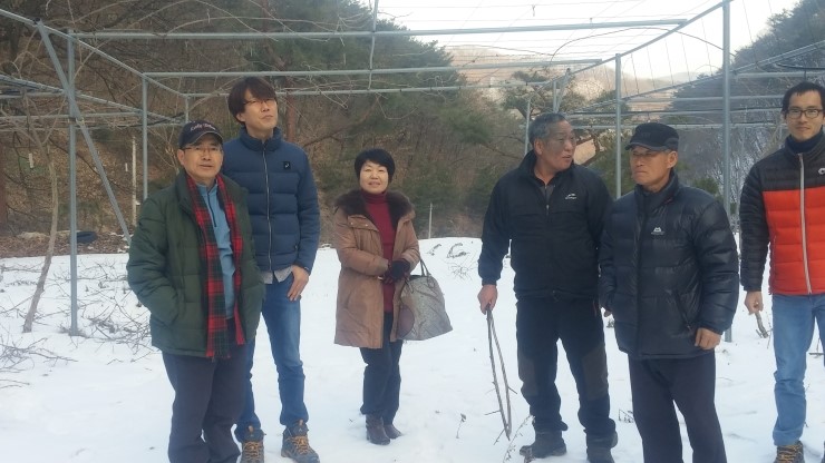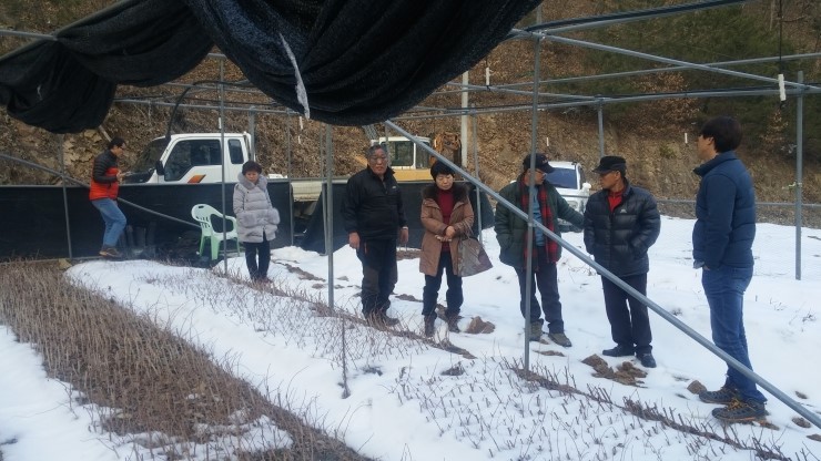 눈 덥힌 토종다래 묘목장을 둘러보고 있군요.