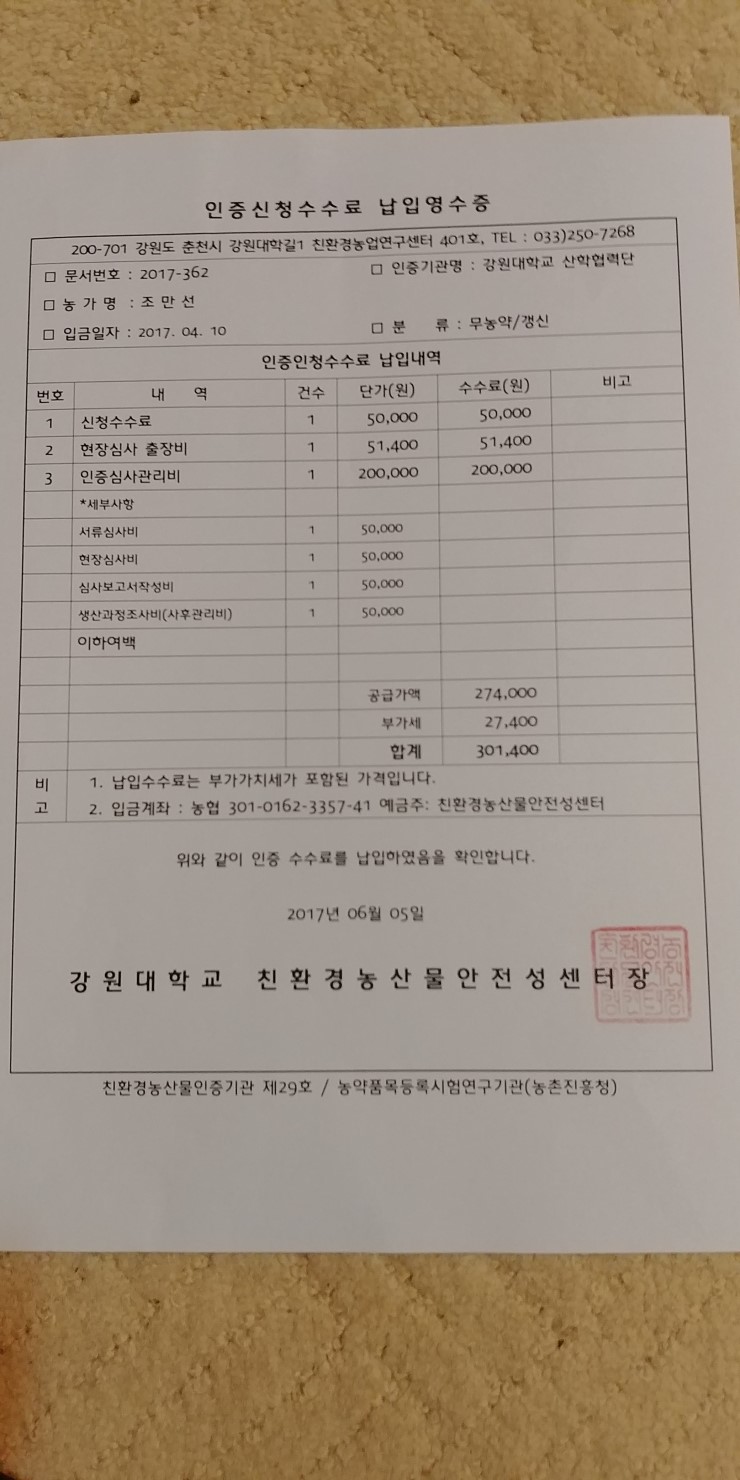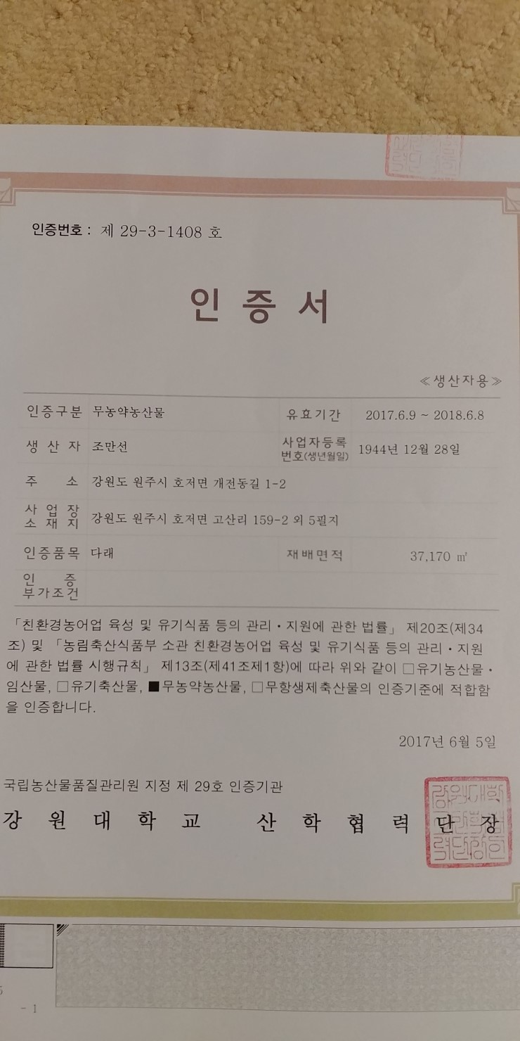 2017년도 갱신 발급된 친환경 인증서가 도착 했네요.