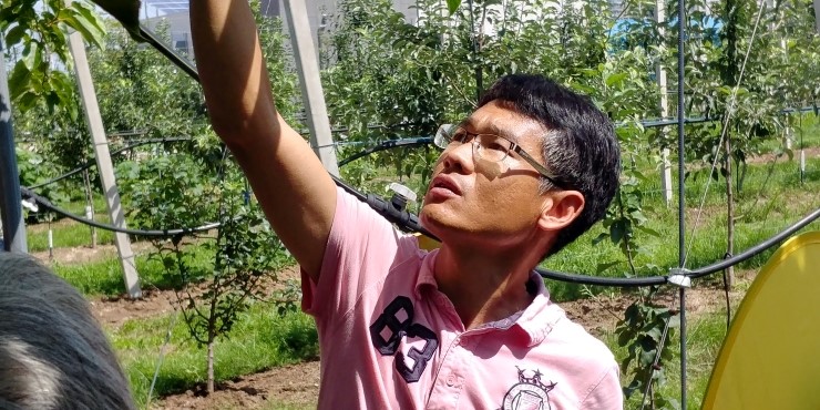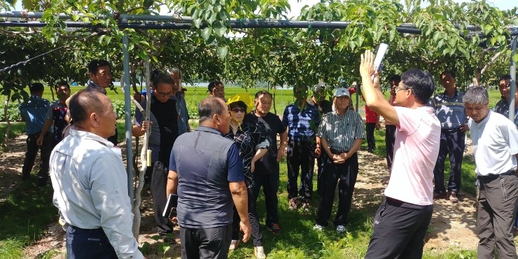 농업기술센터 다래포장에서 원주시 다래 연구회 회원들을 상대로