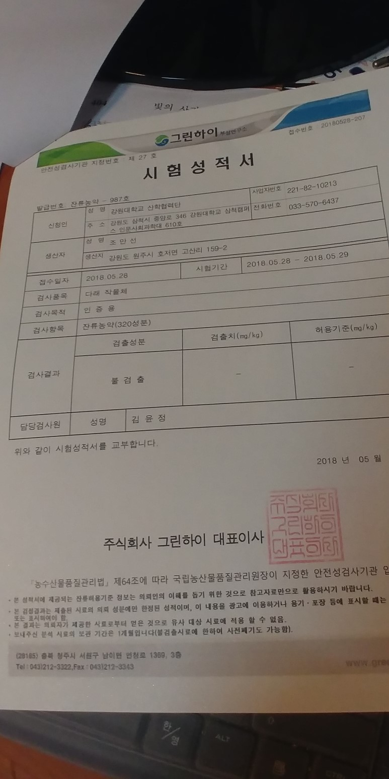 금년에는 인증기관의 요구로 시료를 채쥐하여 잔류농약 검사를 하였답니다