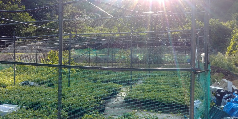 만선다래 묘목장 스프링 쿨러로 물을 주는 모습