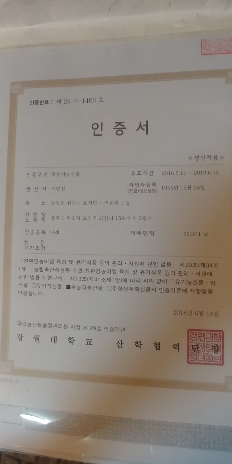 만선다래농원 친환경 무농약 인증서가  교부 되었네요.